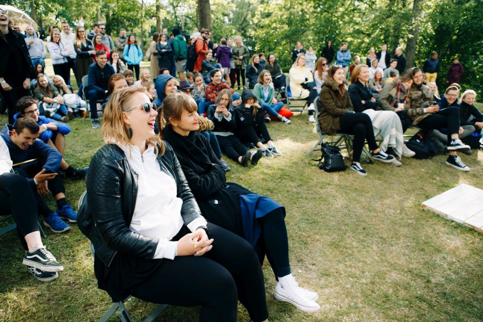 Liels pūlis pulcējas zālienā netālu no vēsturiskās Cēsu pils pilsdrupām. Teritoriju ieskauj koki, radot dzīvīgu, svētku atmosfēru.